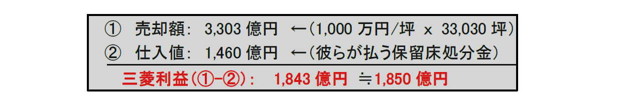 因みに、上記の計算で用いた分譲単価(1,000万円/坪)は低層階の最低販売単価を基準にした極めて保守的な単価であり、より現実的な分譲単価である1,300~1,500万円/坪を基準に考えれば、三菱地所の利益は約2,800~3,500億円にも上る試算となります。