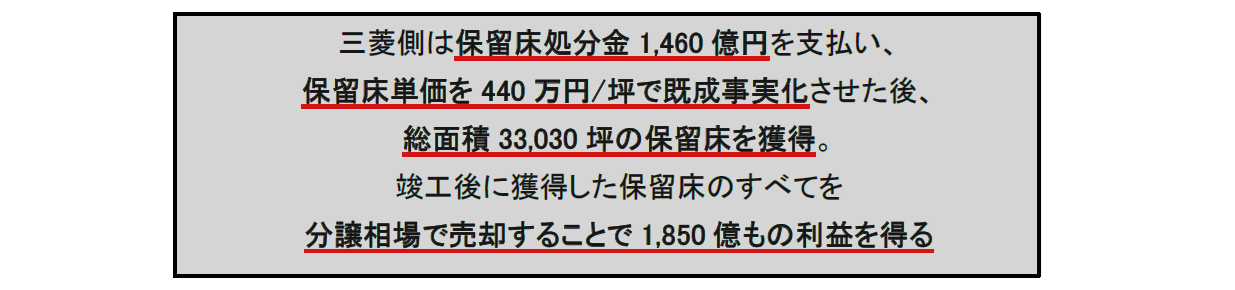 この地区では三菱地所が地権者に対して「等価交換して終わり」を強いる一方で、三菱側は竣工時に1,850億円もの「含み益」を得るとの試算結果が出たことは過去のトピックスで何度も報じている通り。