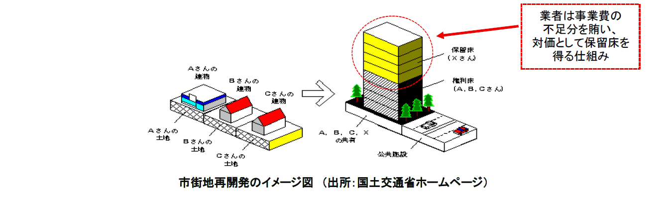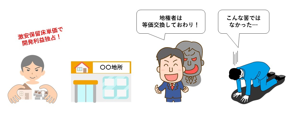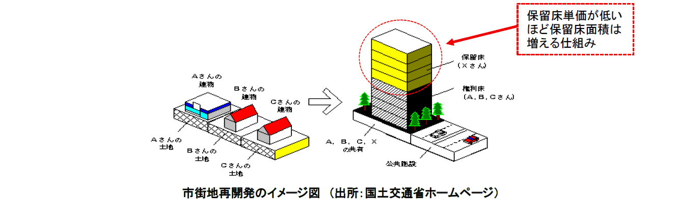 このため、「激安保留床単価」は再開発業者が地権者の取り分(権利床面積)を希釈させるための手口だと考えられています。