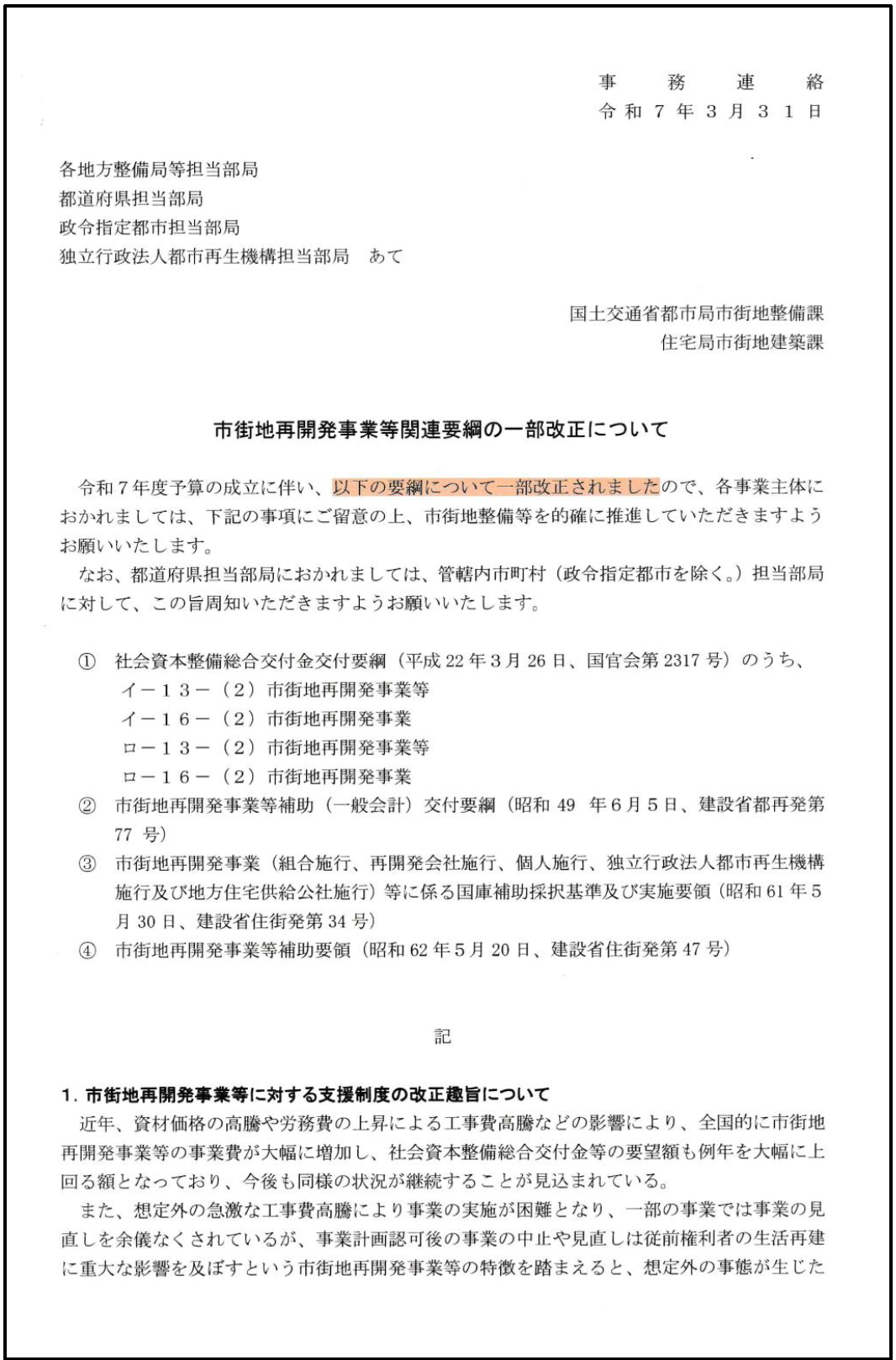 国土交通省は「令和7年(2025年)3月31日付事務連絡書」を関係行政機関に向けて送付し、再開発事業関連要綱の一部が改正されたこと、並びにその詳細規定に関して関係先へ周知徹底を行いました。