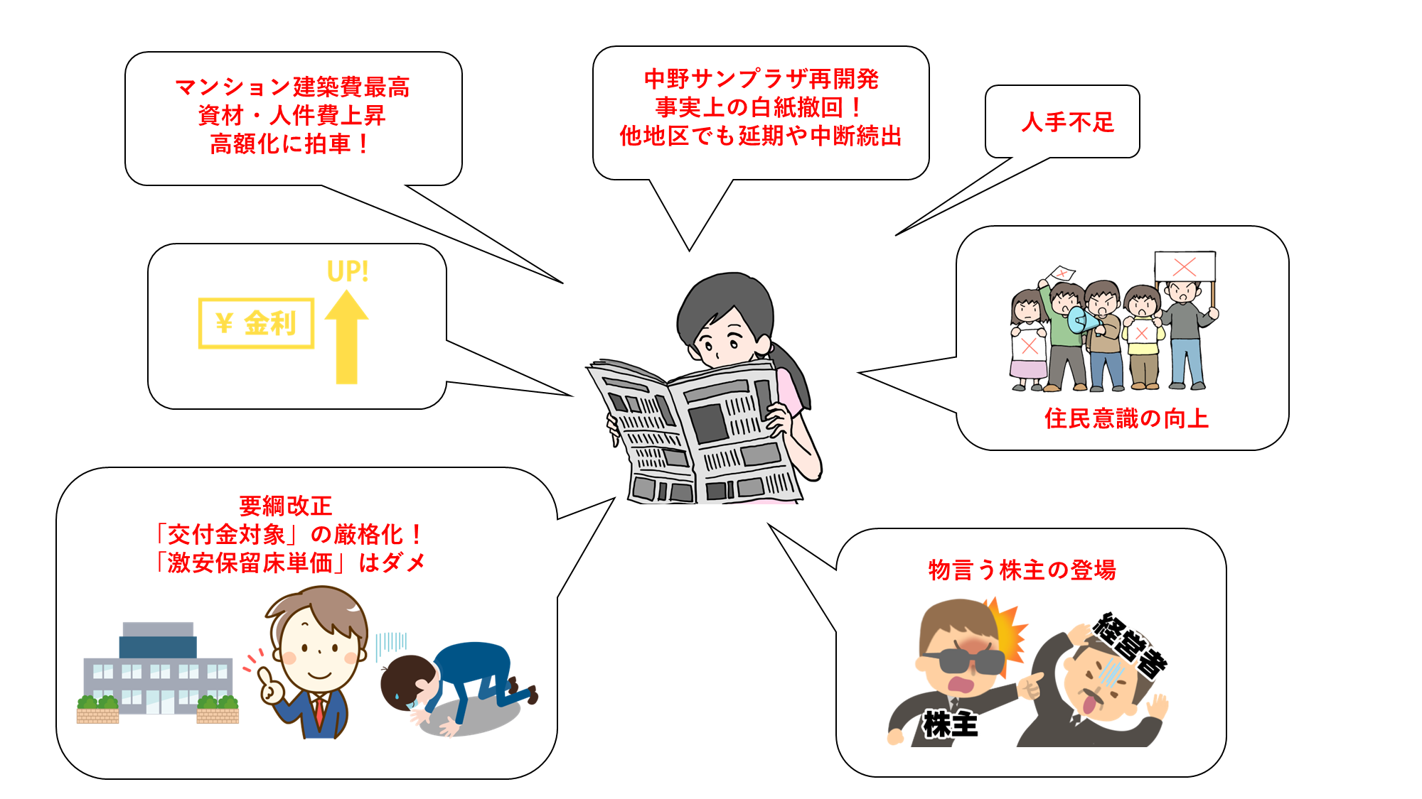 一方、金利上昇は「住宅ローンの返済」など床の購入者側にとっても影響をもたらすため、保留床(タワマンやオフィス)の処分にも影響を与えかねません。結果として再開発業者側には「分譲計画」、「販売価格」、「賃貸条件」等の調整を通じて事業計画の見直しや延期を迫られる懸念が生じます。