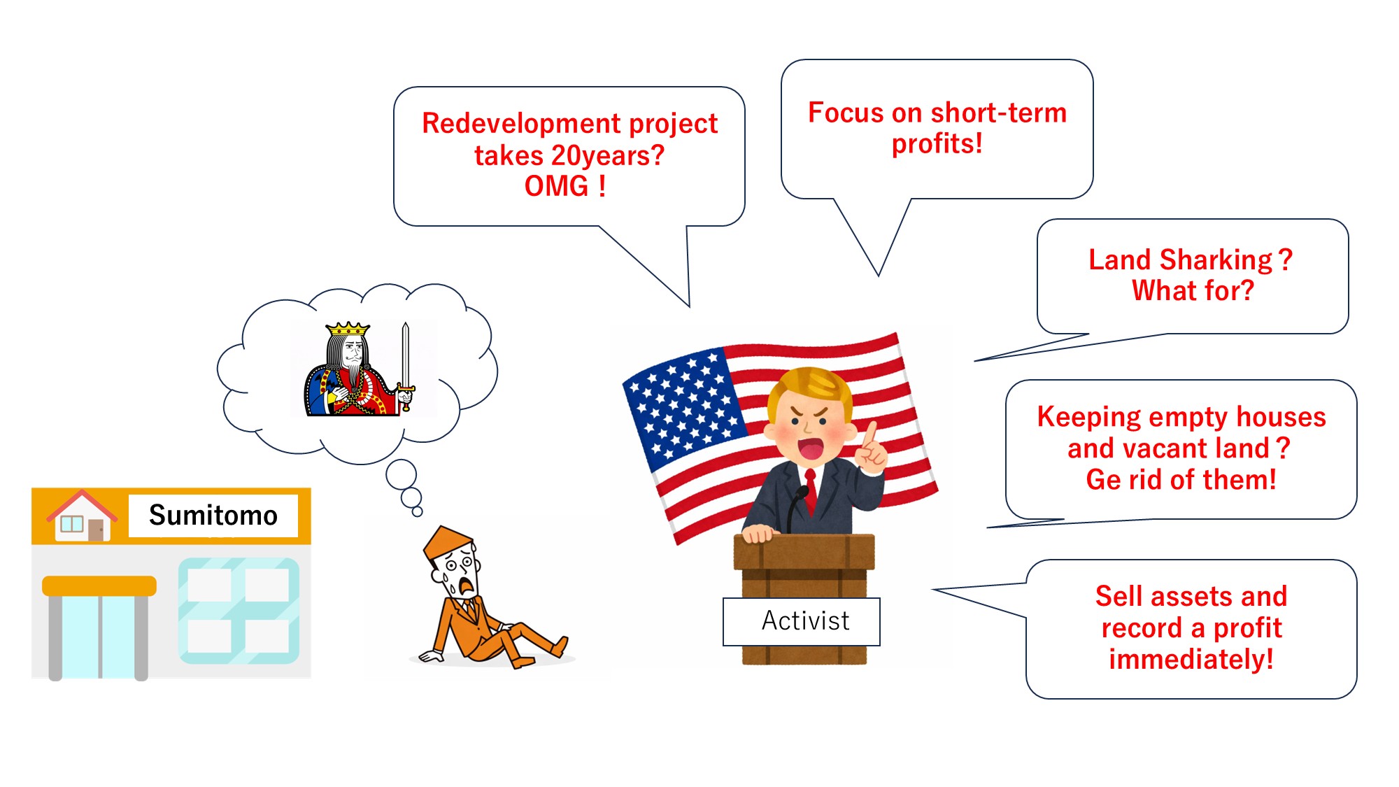 • Activists view prolonged holding of vacant properties as inefficient capital allocation.To their eyes, this kind of commercial activity appears to be nothing but an“untolerable inefficient business transaction.”
