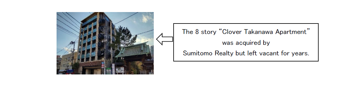 In Sengakuji, Sumitomo had been aggressively acquiring local properties, leaving a newly constructed rental apartment building “Clover Takanawa” completely vacant for a long period as if redevelopment was inevitable. However, since Elliott’s appearance, the building has started filling with tenants, which may suggest that activists’ pressure influenced the shift—because a wholly vacant building represents an unused asset that produces no revenue.